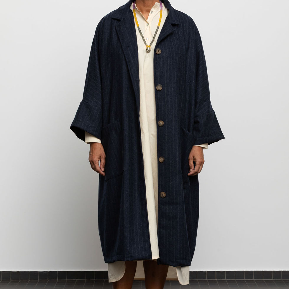 Long, loose-fitting coat in pinstripe fabric. Wide sleeves and dropped shoulders. Classic lapels and front closure buttons. It has plaston pockets on the sides and a pleat on the back that gives it volume and movement.