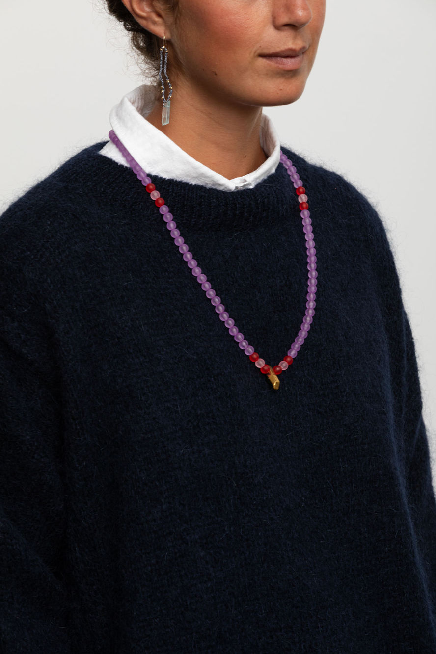 Necklace made of violet, red, and transparent resin beads with quartz painted in metallic gold. Each necklace is a unique and striking piece that combines the natural beauty of quartz with a shiny metallic finish.
