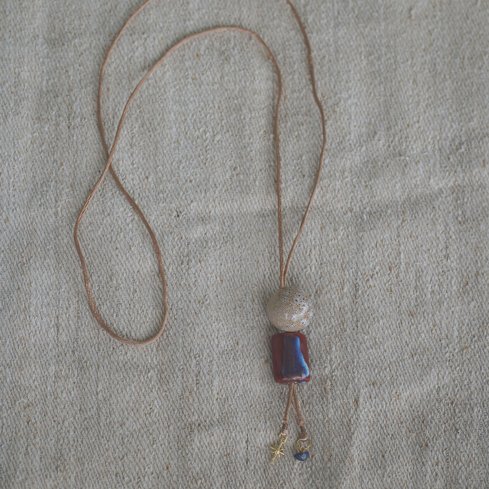 Two prominent pieces of painted and glazed ceramic with a nude-colored silk cord. Each piece of ceramic is unique. Inspired by the wooden dolls of yesteryear. It features a golden North Star and a natural stone at the base.