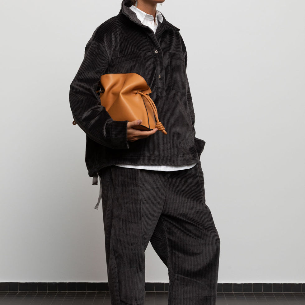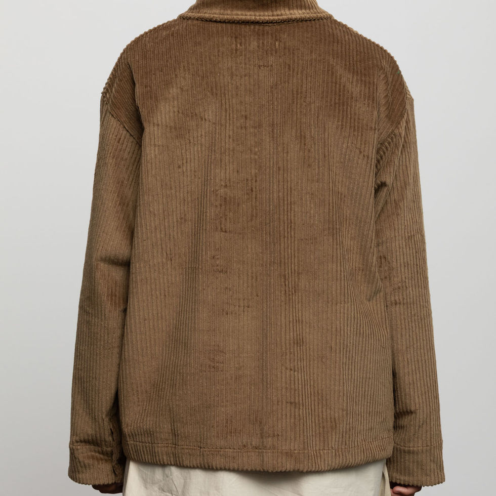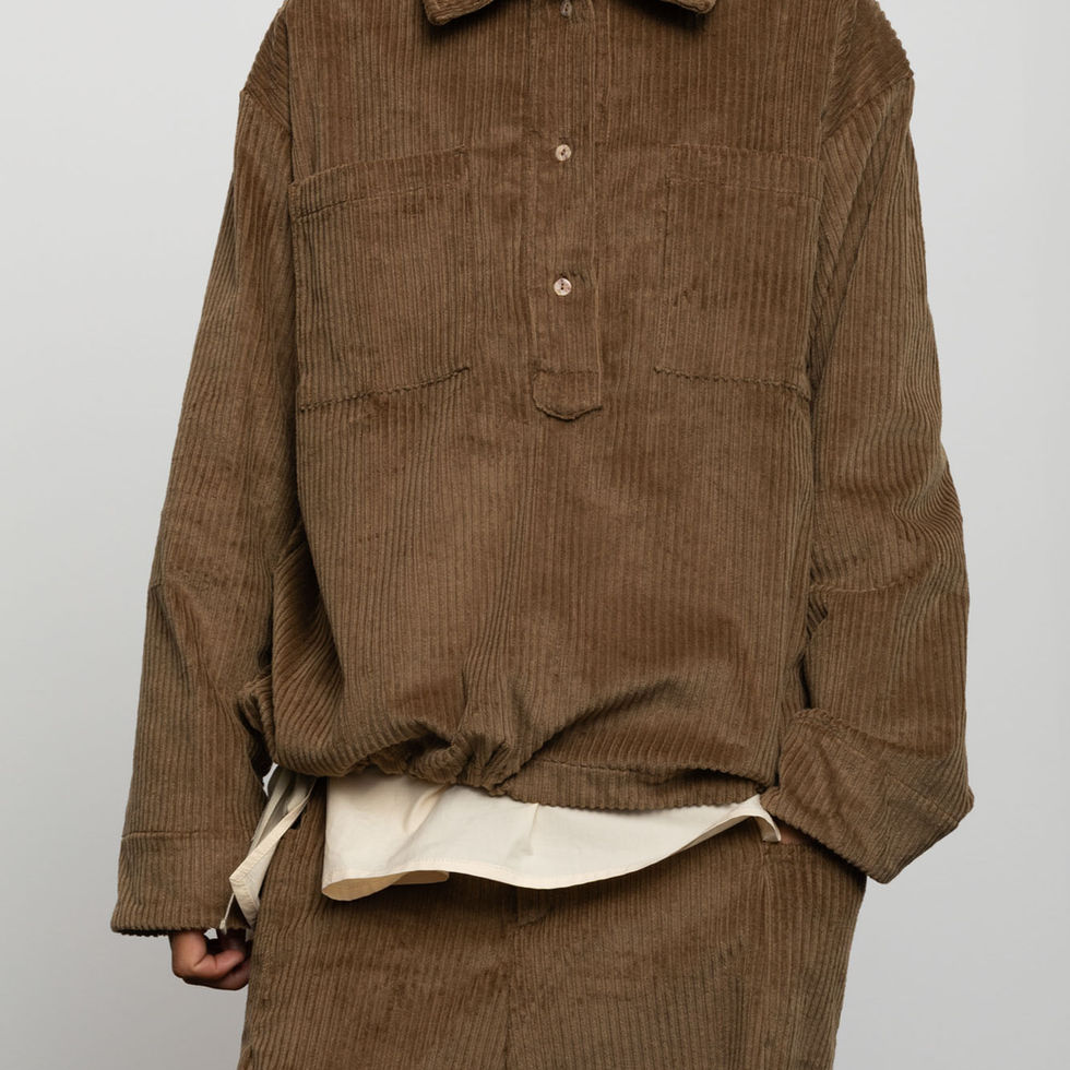 It features a shirt collar, three-button front closure, and patch pockets on the chest.