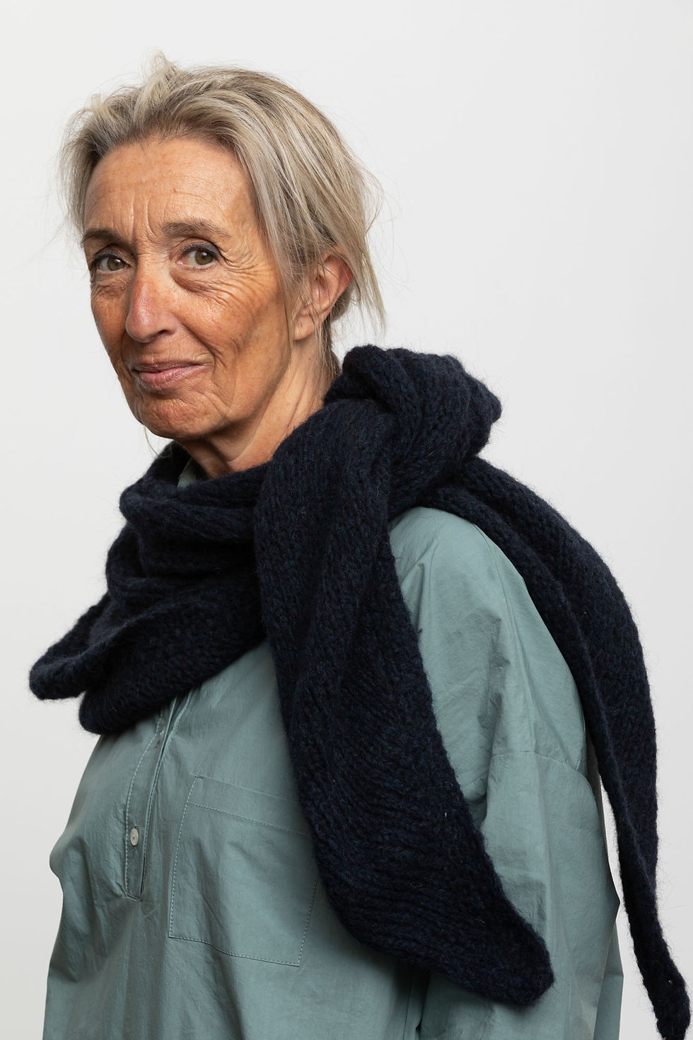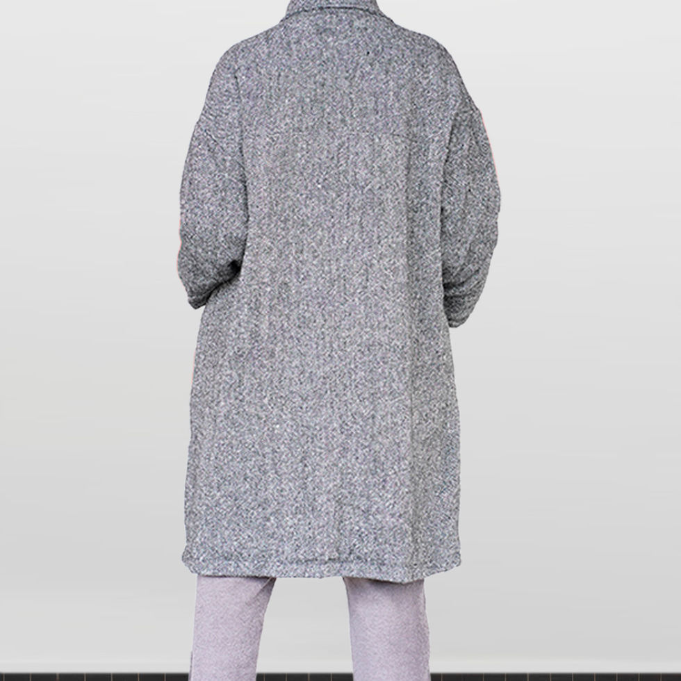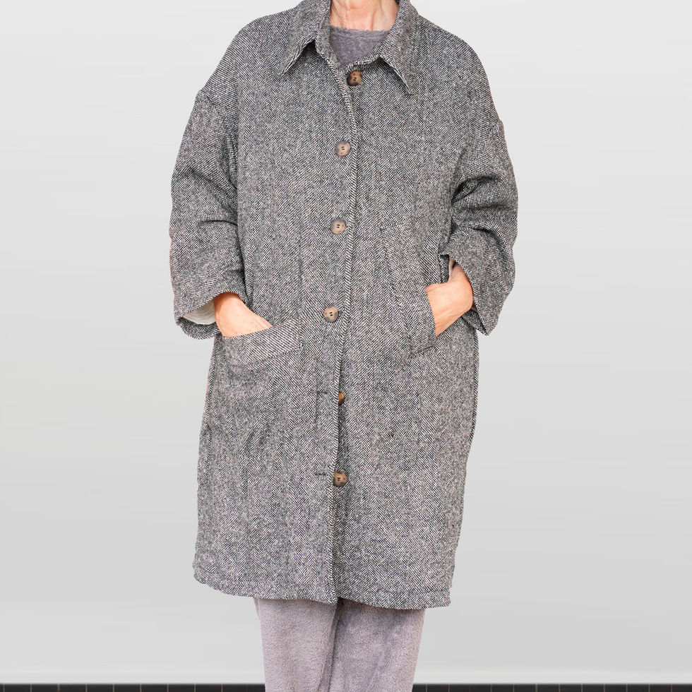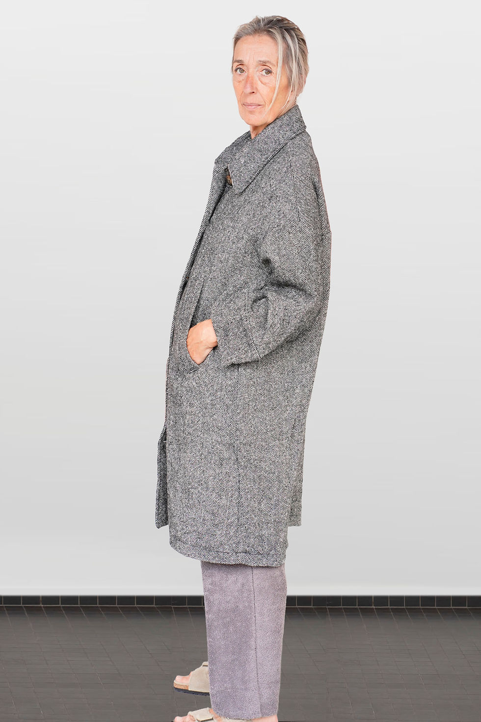 Straight-cut coat with a loose silhouette in a woolen washed fabric and cotton lining. It features long, wide sleeves, a classic collar, and a front closure with visible buttons. Mid-length and asymmetrical pockets. It has been treated to achieve a faded, worn appearance.