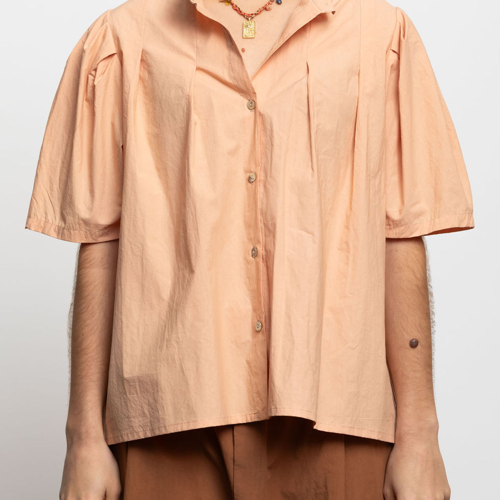 Mangas cortas y anchas con un ligero fruncido en el hombro que le da un volumen sutil.