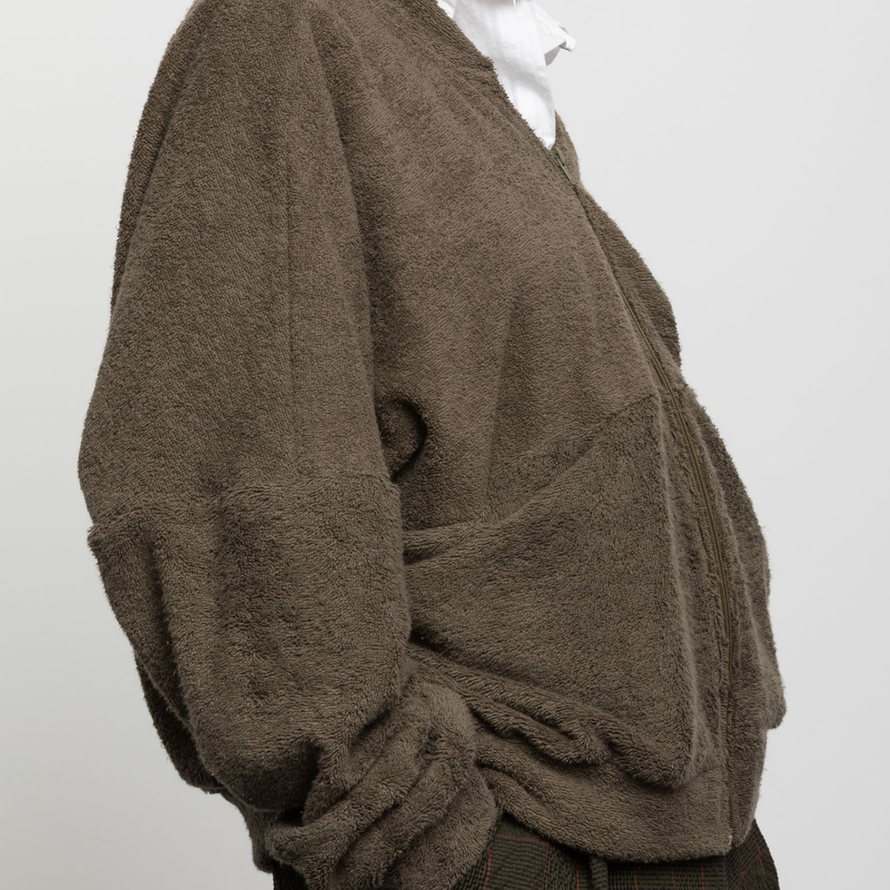 Sudadera de estilo relajado,confeccionado en tejido rizo de tacto suave.Tiene cierre frontal con cremallera ,manga larga y dobladillo elastico.De largo hasta la cadera ,incorpora bolsillos que aportan practicidad y un aire urbano.